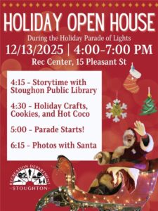 Stoughton will be getting into the holiday fun on Saturday December 13! They will be having a Christmas light  parade plus  Storytime, Holiday Crafts, Cookies, Coco, and Photos with Santa all take place at the Rec Department at 15 Pleasant St. Bring the kids to the fun weekend event.