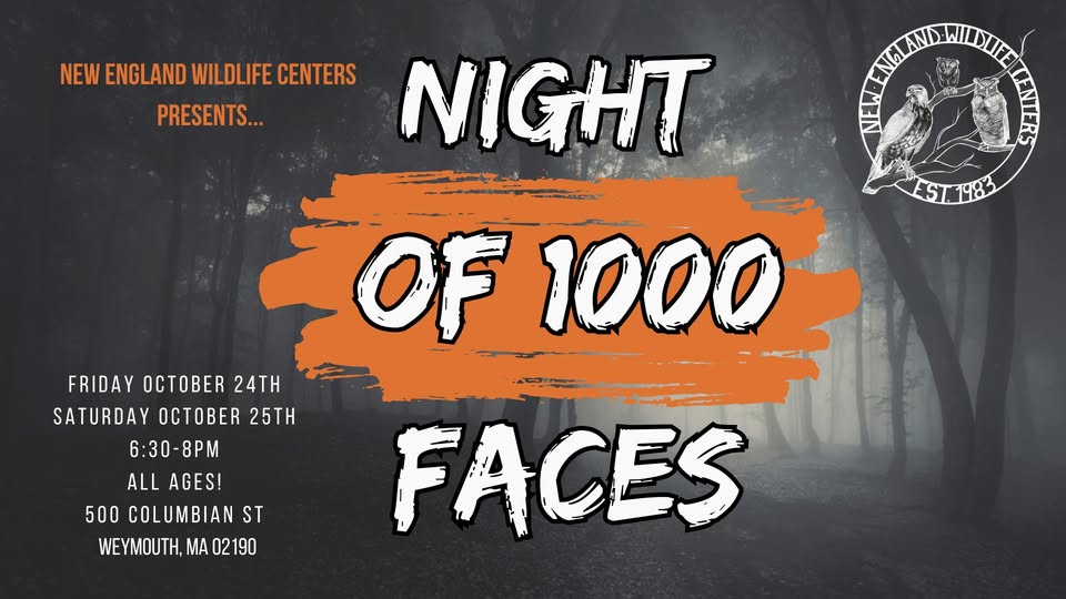The Night of a Thousand Faces will be held on Friday October 24th and Saturday October 25th 2025 from 6:30 PM to 8:00 PM at the New England Wildlife Center in Weymouth. Admission is $12.50 , and all proceeds go toward the care of our wildlife patients.