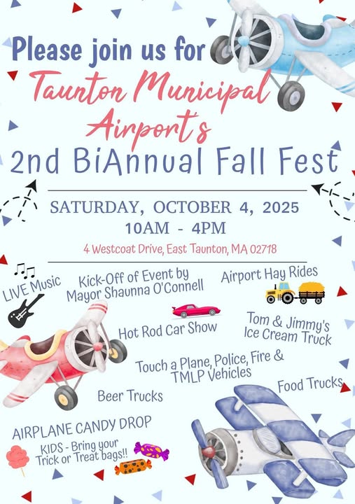 Get ready for an action-packed day of family fun! Join us for the Taunton Municipal Airport’s 2nd Bi-Annual Fall Fest on Saturday, October 4, 2025, from 10 AM to 4 PM at 4 Westcoat Drive, East Taunton, MA 02718.